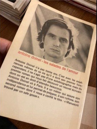 Renseignements pris, François Truffaut avait fait fabriquer une série de fac-similés des Salades de l’amour. Il ne s’agit donc pas d’un exemplaire unique. Les photos en ligne permettent de découvrir que le livre factice a été réalisé d’après un invendu de Vive la Suranie d’André Miquel. Je découvre le quatrième de couverture : “Antoine Doinel vit à Paris. Il a un métier qui assure son indépendance et lui permet de préparer, à son rythme, son second roman dont il nous a confié le titre : Manuscrit trouvé par un sale gosse”.